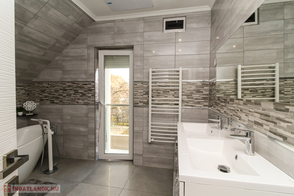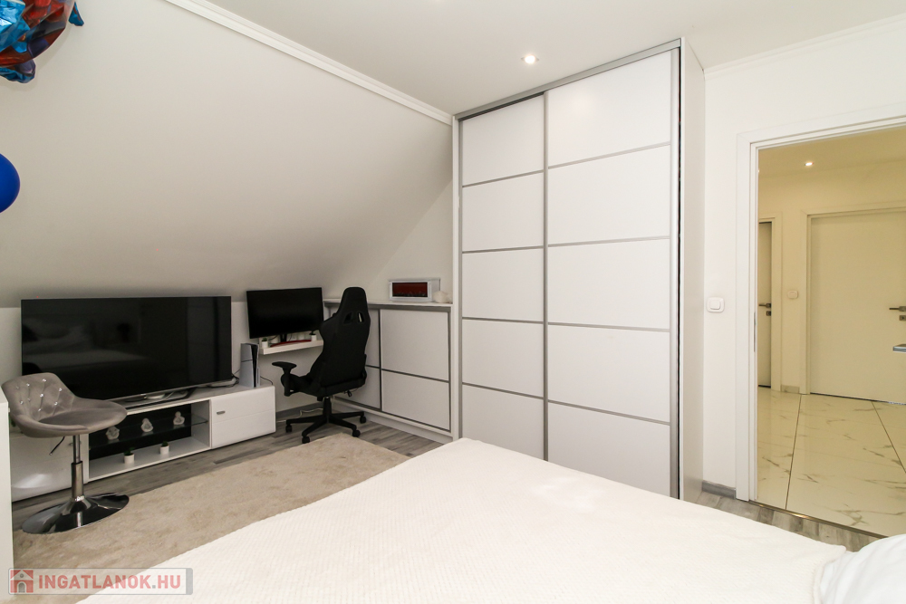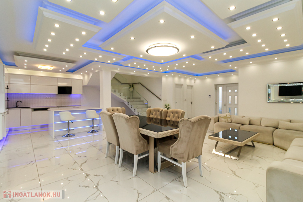 A sík telken fekvő családi ház kiemelkedik a kertváros többi ingatlanai közül külső megjelenésében, mégis visszafogott, nem hivalkodó. A bejárati ajtón belépve a 60 nm-es impozáns nyitott konyha nappali együttese tárul elénk, ami a belső nettó 172 nm-es kétszintes ház központja és kapcsolódik hozzá egy 17 nm kertre néző terasz.
