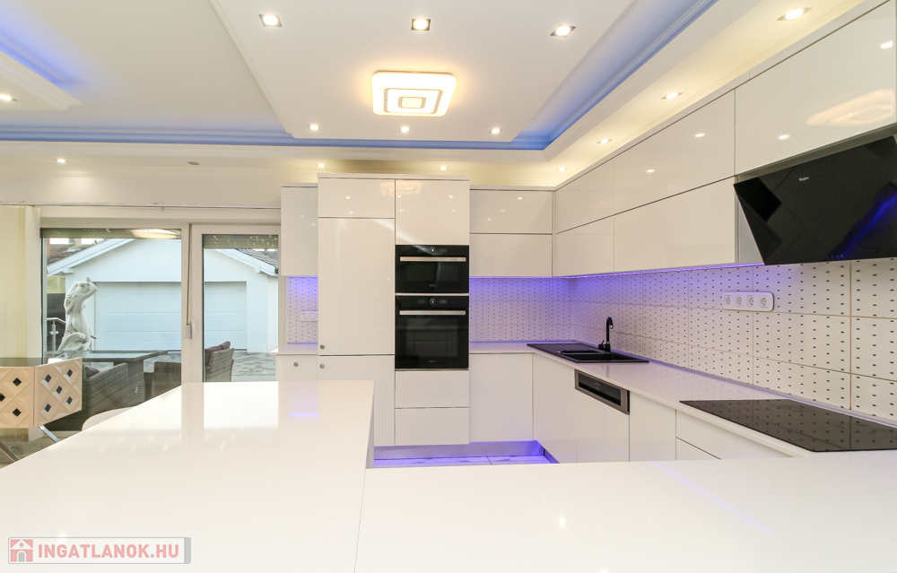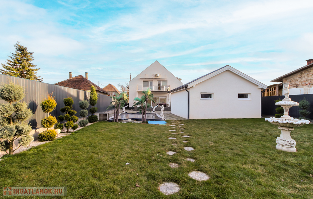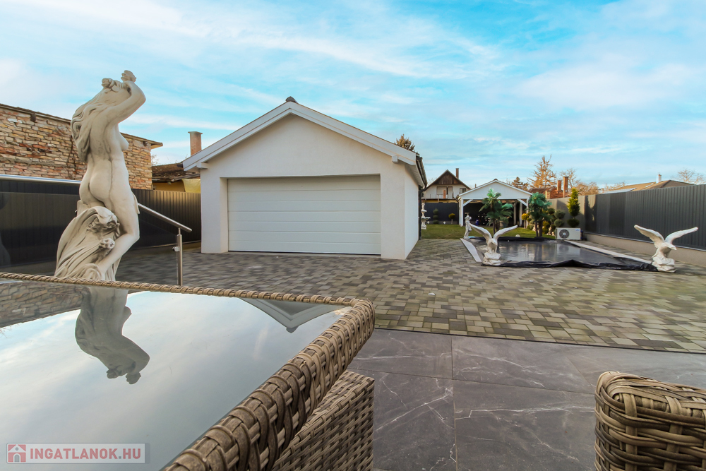 Kertje az otthoni kikapcsolódást maximálisan kiszolgálja. Dísznövényekkel tarkított és dekorvilágítással felszerelt, az automata öntözőrendszer wifi-ről vezérelhető. A 4 x 7 méteres medence természetesen fűthető, a 25 nm-es filagória alkalmas grillezésre, családi összejövetelek megtartására. A 42 nm-es fűthető garázsban 2 autó kényelmesen elfér.
